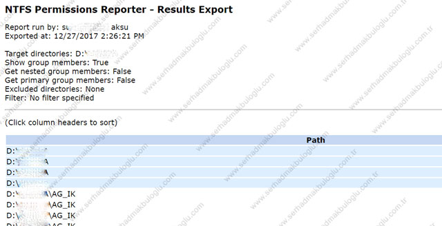 File server üzerindeki kullanıcı veya kullanıcı gruplarının sahip oldugu yetkileri export etmek için aşağıdaki scripti kullanabilirsiniz. $path = "\\fileserver\scan" $reportpath ="C:\Users\smk\desktop\ACL.csv" dir -Recurse $path | where { $_.PsIsContainer } | % { $path1 = $_.fullname; Get-Acl $_.Fullname | % { $_.access | Add-Member -MemberType NoteProperty '.\Application Data' -Value $path1 -passthru }} | Export-Csv $reportpath