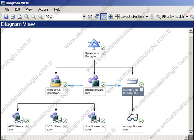 2)Karşımıza gelen diagram penceresinde kendisini SCOM’a raporlayan bütün server ve client makinalarımızı görebiliriz.Aynı zamanda hangi makina kime bağlı,üzerinde çalıştırmış olduğu rol nedir ve domain ortamımız ile alakalı kilit bilgiler elde edebiliriz.