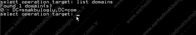 7) list domain yazarak ortamdaki bütün domainleri listeliyoruz.